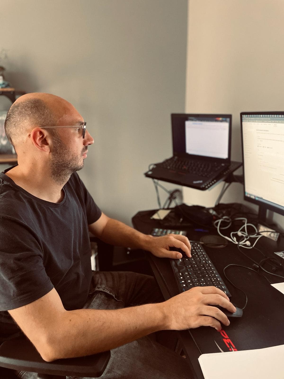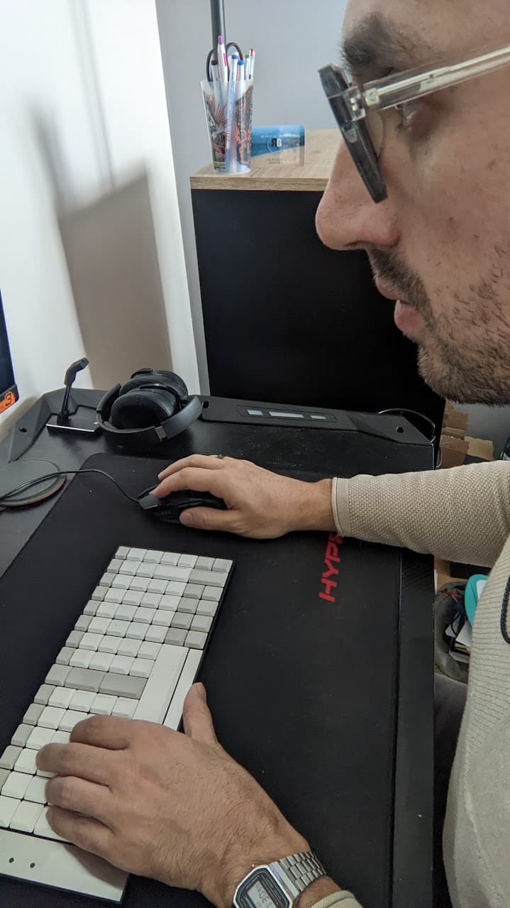 J'ai travaillé sur Windows, Linux et maintenant MacOS. J'utilise un clavier Typematrix en 'bépo', un écran secondaire de 27 pouces. Bientôt le bureau assis-debout pour compléter un environnement de travail sain.