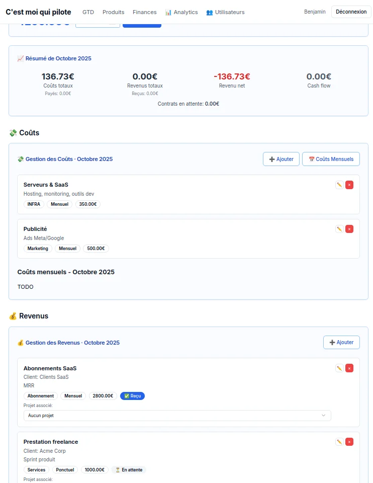 C'est‑moi‑qui‑pilote - Cockpit pour indie hackers/freelances — idée → exécution → résultats